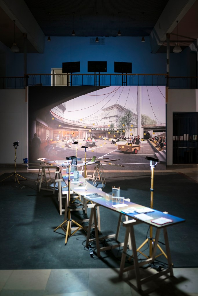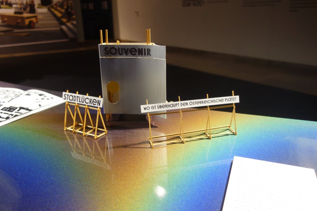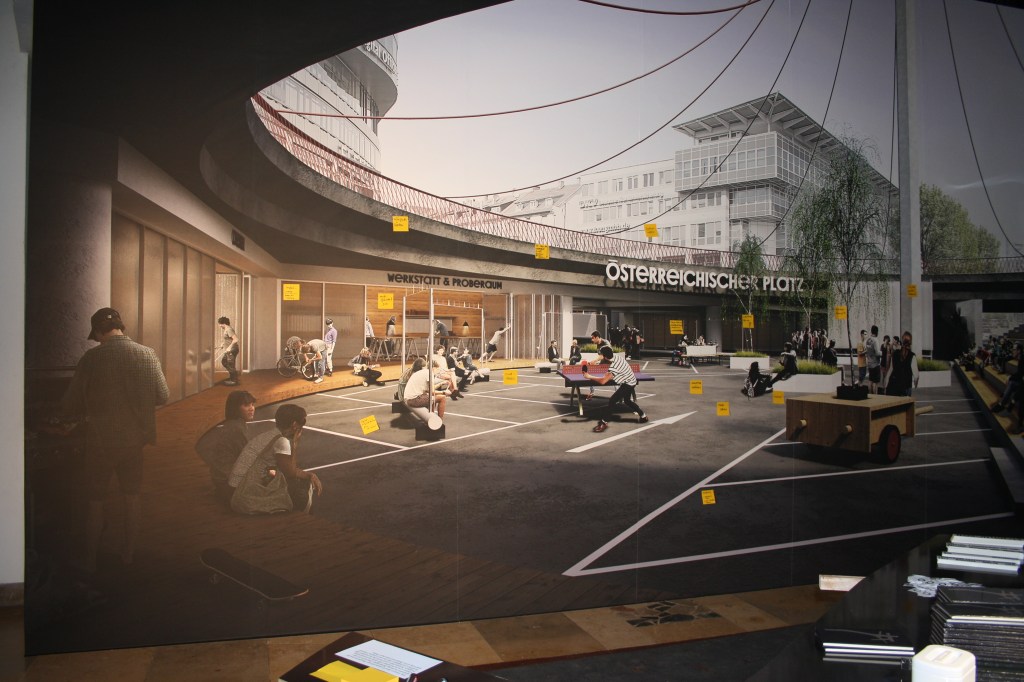 Mit dem (urbanen) Format eines Billboards zeigt Stadtlücken in der Ausstellung eine Vision des österreichischen Platzes wie er vielleicht in Zukunft aussehen könnte: Ein urbanes Spiel- und Experimentierfeld, das für Alle offen steht und nutzbar ist und damit eine (disruptive) Vision des öffentlichen Raumes formuliert, wie er heute in einer am Tauschwert orientierten Stadtplanung nicht mehr anzutreffen ist. Eine 24 qm große Plakatwand, die in den Ausstellungsraum eingefügt wurde, zeigt die Vision eines lebenswerten, autofreien Österreichischen Platzes (der heute noch von einem Parkbetreiber genutzt wird),. Diese Plakatwand ist als Angebot an die Besucher gerichtet, an dieser Vision gedanklich weiterzuarbeiten und zum konzeptuellen Teilhaber des Österreichischen Platzes zu werden.