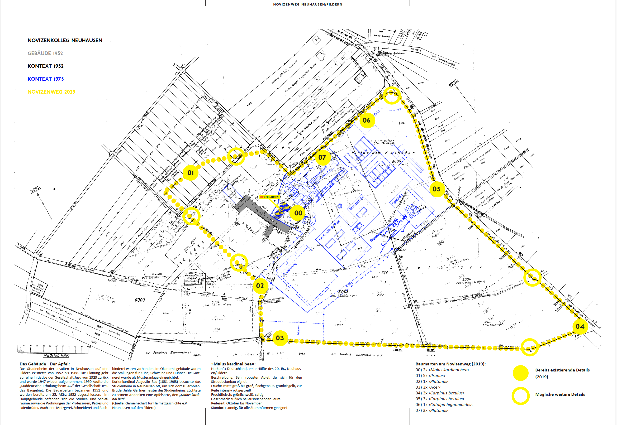Der Rundweg beginnt bei der baubotanischen Installation mit Kardinal Bea Apfelbäumen im Außenbereich der ehemaligen Rupert-Mayer-Kapelle (dem heutigen Ausstellungsort des Kunstvereins) und führt entlang der historischen Grenze des Jesuitenkollegs, das bis 1968 in Neuhausen angesiedelt war und dort ebenfalls botanische Studien betrieb.
