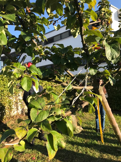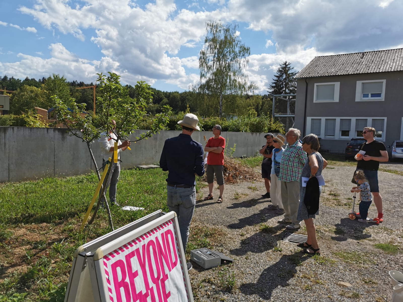 Aktion mit den Apfelbäumen der Sorte „Kardinal Bea“, die ursprünglich am Jesuiten-Kolleg in Neuhausen gezüchtet wurden. Baubotanischer Rundgang mit Erklärungen des Bureau Baubotanik, Hannes Schwertfeger und Oliver Storz. Der „Baubotanische Novizenweg“ führt entlang der historischen Grenze des ehemaligen Jesuitenkollegs, das bis 1968 in Neuhausen angesiedelt war und dort ebenfalls botanische Studien betrieb.