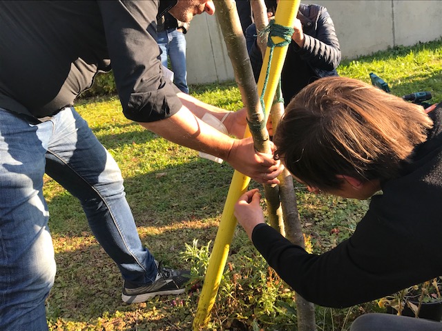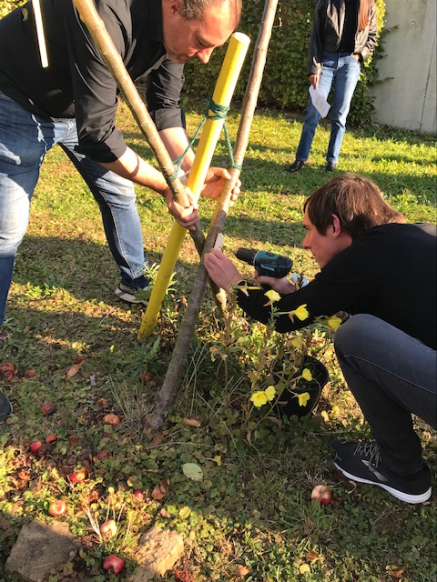 Aktion: Verspannen der beiden Kardinal-Bea-Apfelbäume, die in den nächsten Jahren durch das „Baum-Piercing“ zusammenwachsen sollen. Foto: KVN