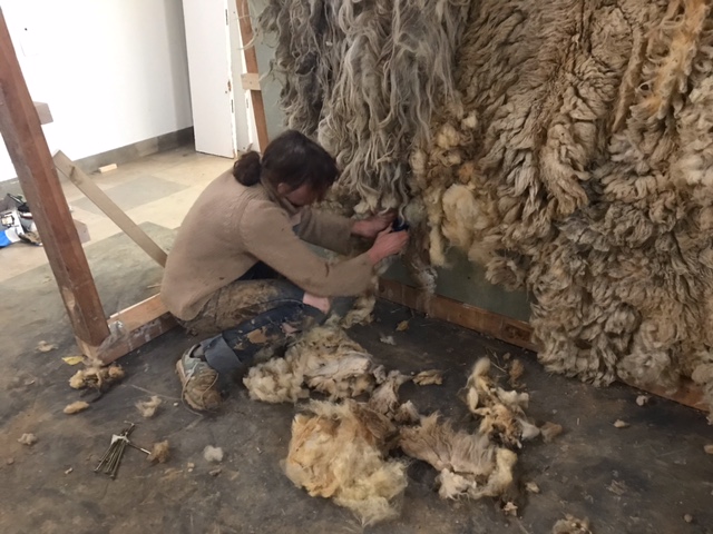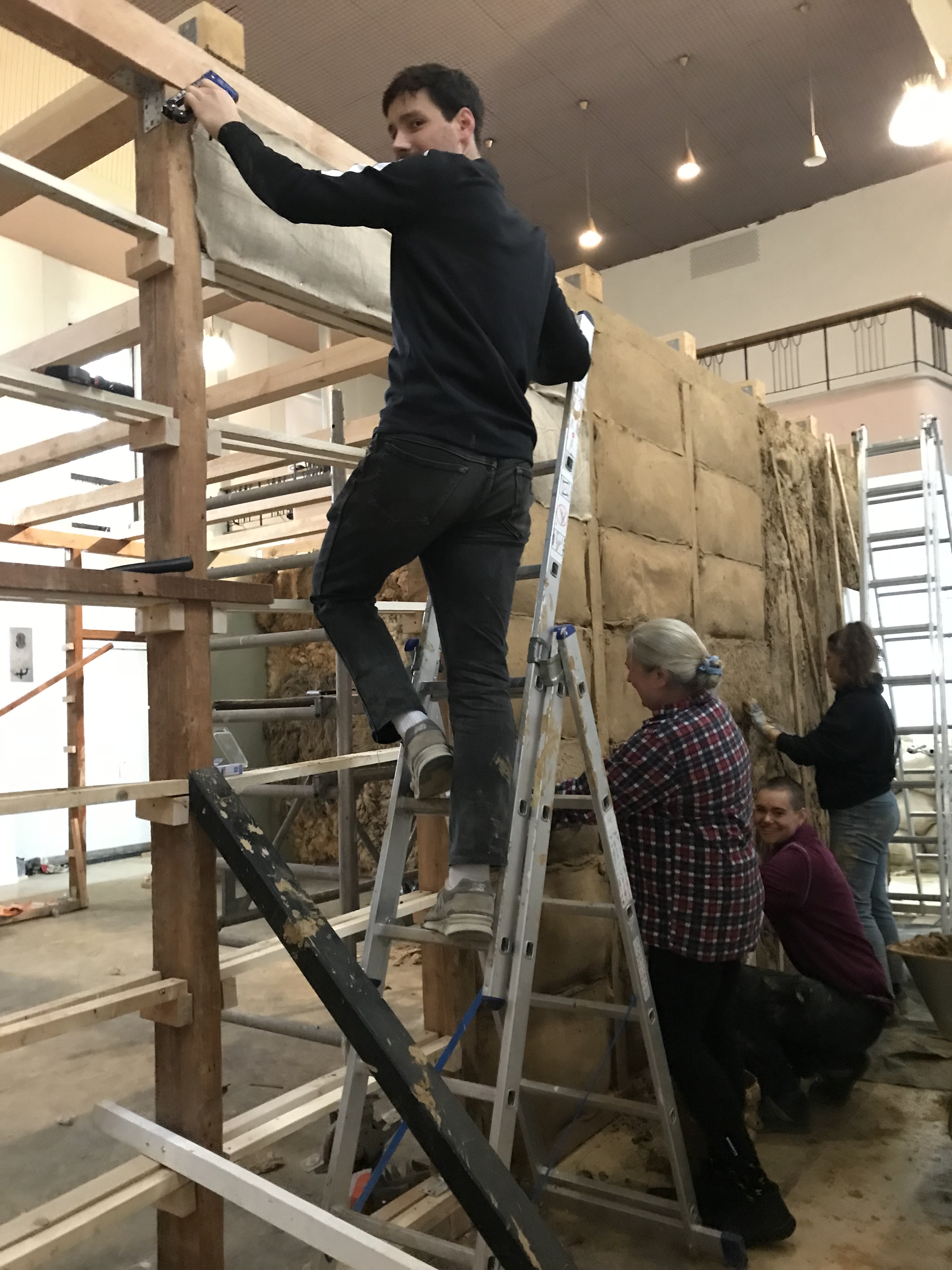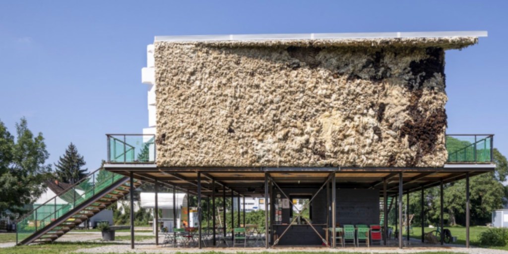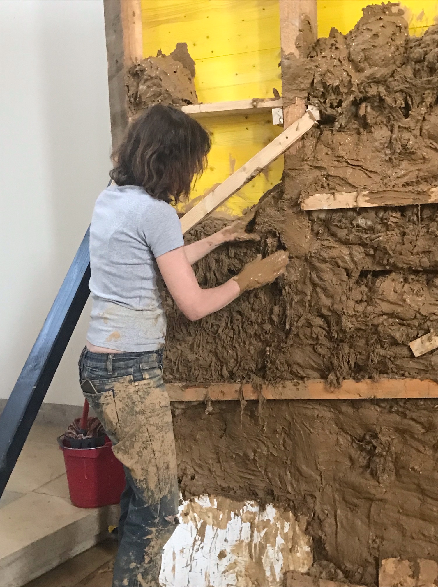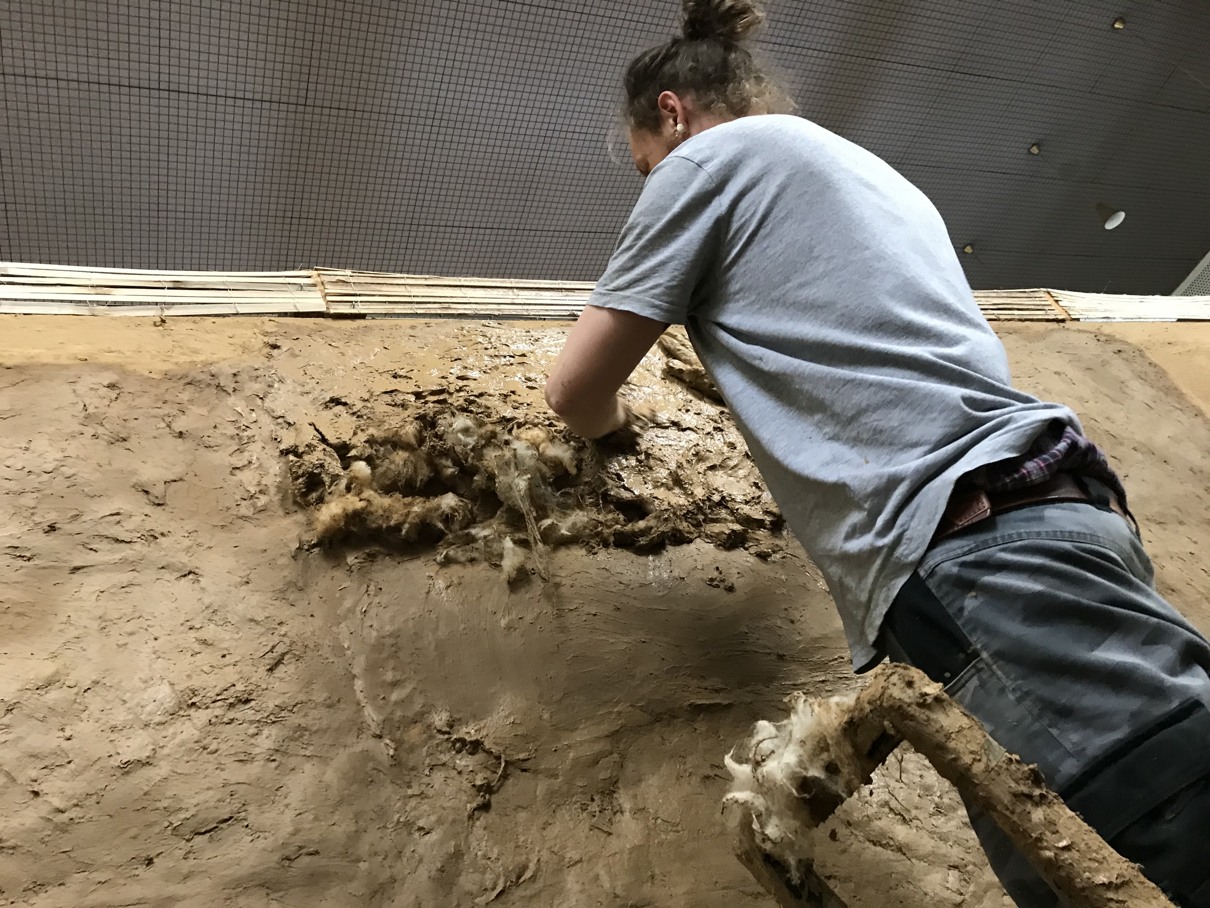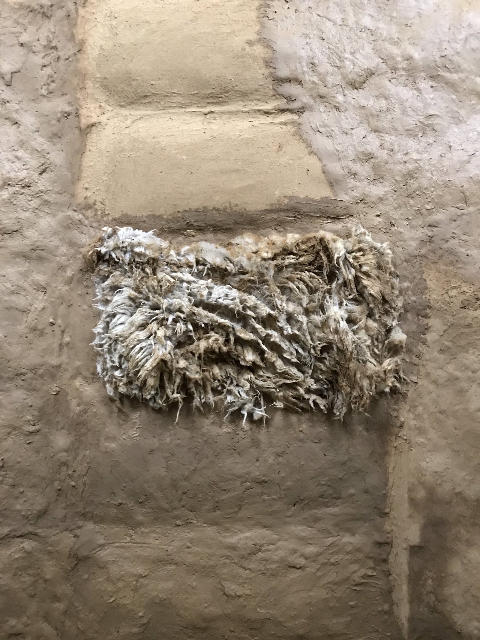 Das Projekt, das Folke Köbberling speziell für den KV Neuhausen konzipiert hat, geht von drei Werkstoffen aus: Rezykliertes Holz, Schafwolle und lehmhaltige Erde, also natürliches, tierisches und mineralisches Material. Schon seit geraumer Zeit experimentiert Folke Köbberling mit Lehm und Schafwolle. Beide Materialien sind als Werkstoffe nicht mehr geschätzt. Speziell in der Schafwolle sieht die Künstlerin, im Unterschied zu den handelsüblichen Dämmplatten aus Styropor und ähnlichen Kunststoffen, die in den nächsten Jahrzehnten als Berge von Sondermüll zu entsorgen sein werden, den idealen Werkstoff zur energetischen Dämmung und plastischen Verhüllung von Habitaten und Gebäuden. Ein Vorteil dieses tierischen Abfallprodukts besteht darin, dass es sich nach Gebrauch auf natürliche Weise zersetzt und noch als Düngemittel verwendet werden kann.