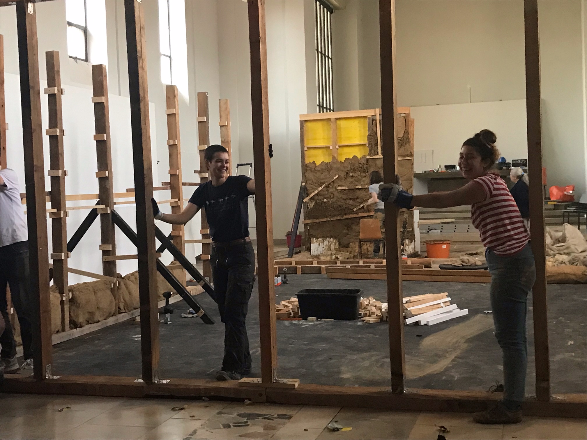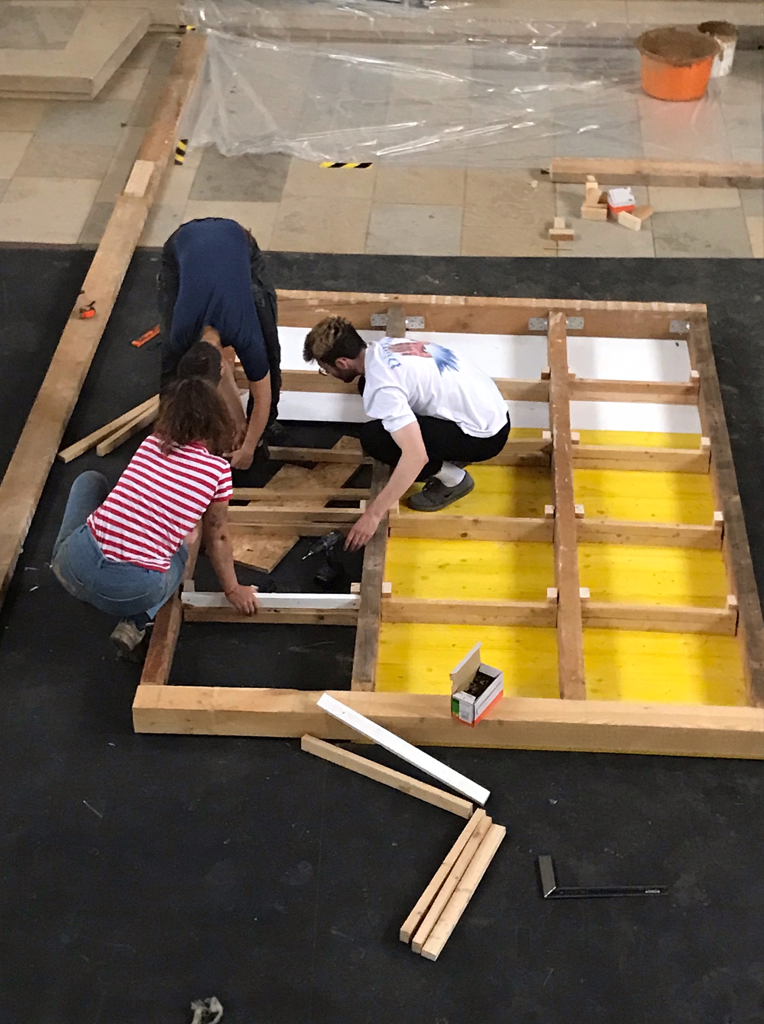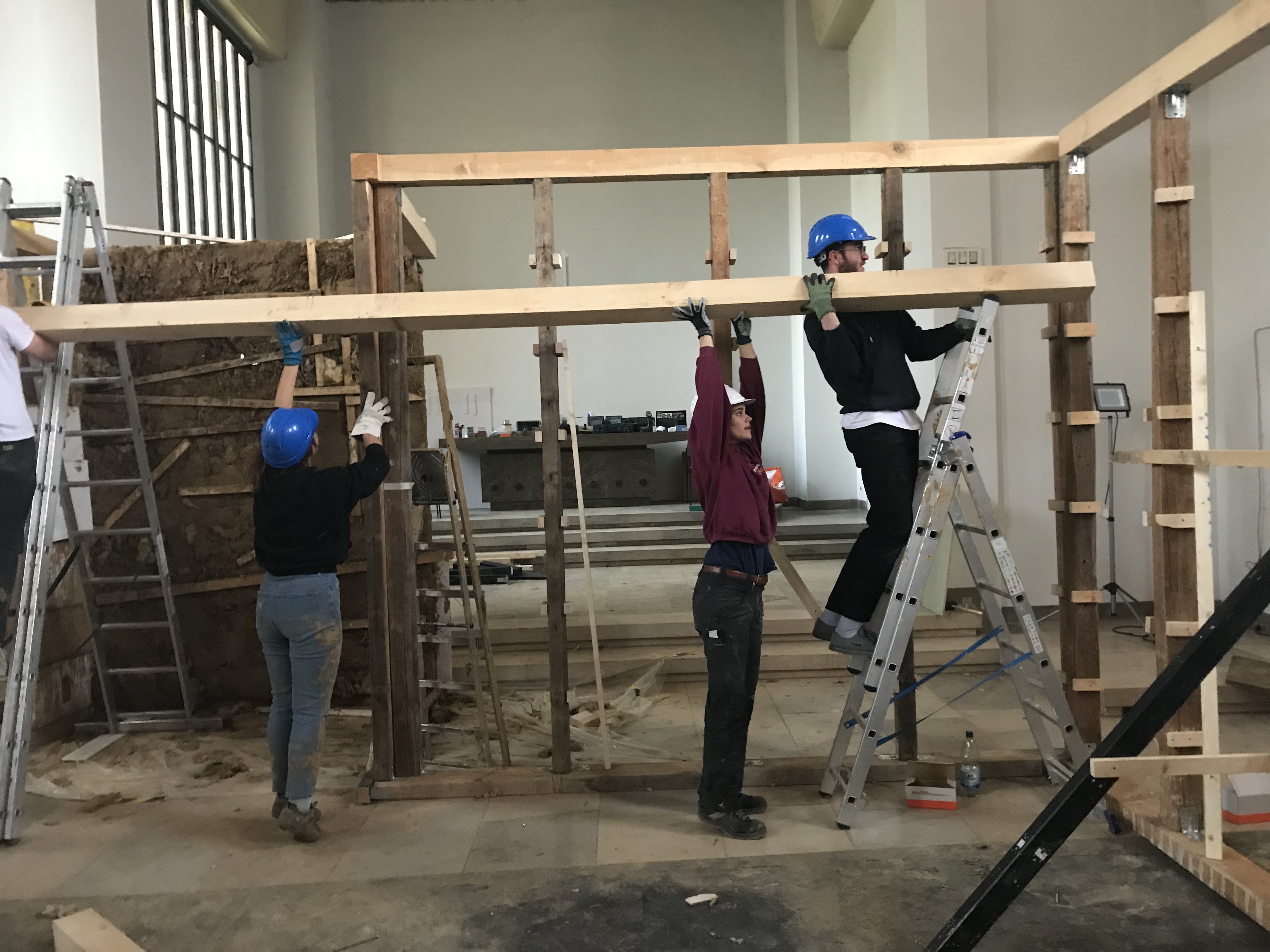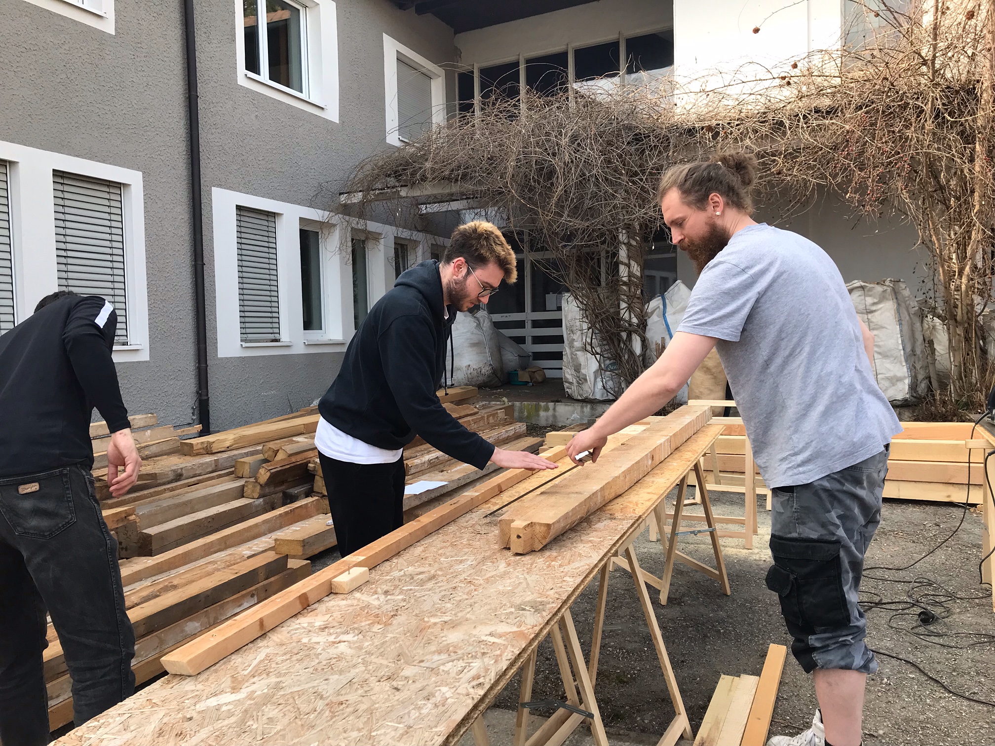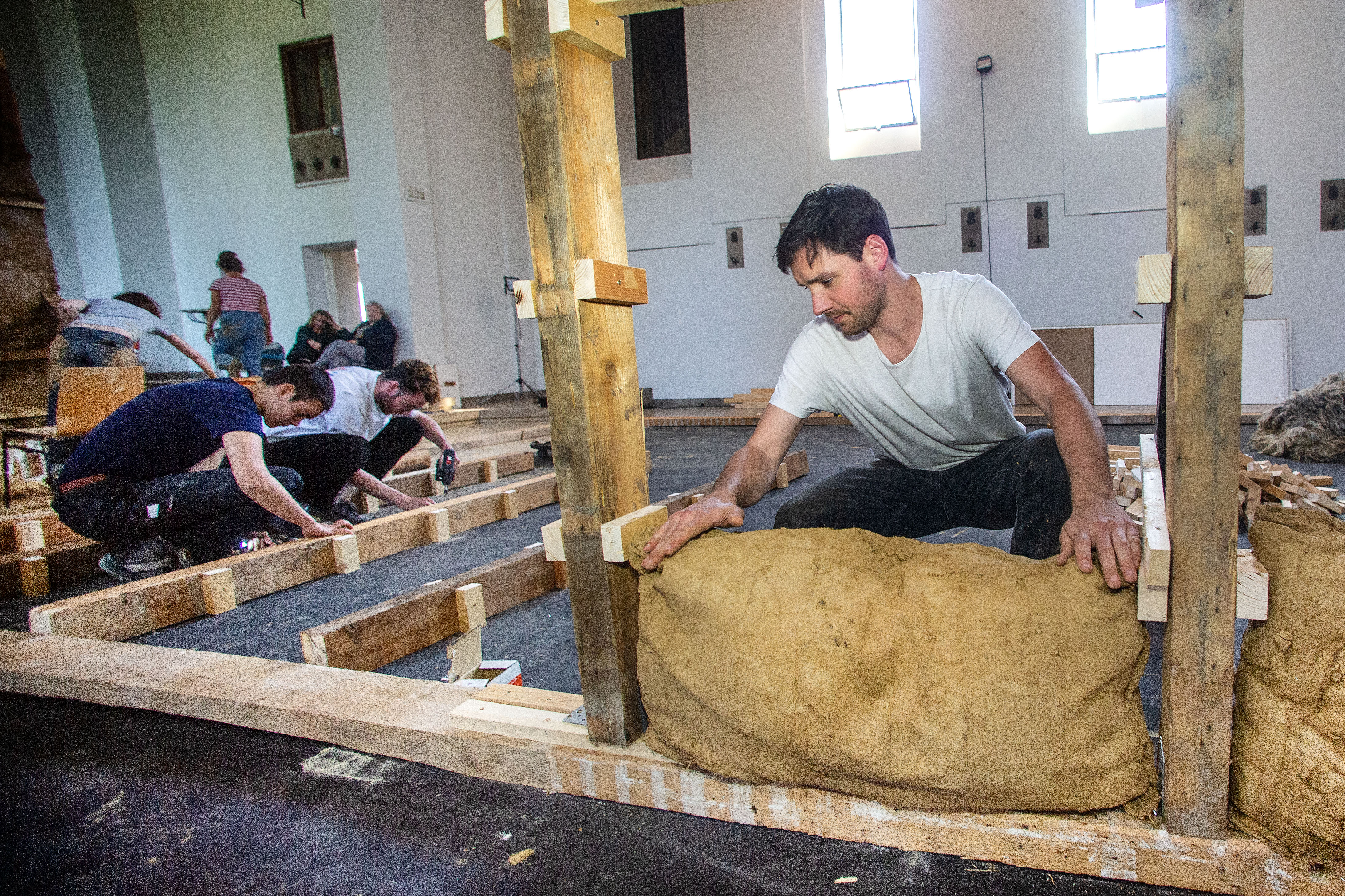 Lokal – Regional: Das für das J.J.P. Oud-Modell verwendete Material stammt aus der Region. Die Schafwolle wird von der Schäferei Frank Lamprecht (Oberndorf) gespendet. Das Holz für die Unterkonstruktion wird von einem Abbruchhaus des Architekturbüros eichenlaub schöller | architekten (Remshalden) zur Verfügung gestellt. Der lößhaltige Lehm stammt von dem Wertstoff-Recyclingbetrieb Heinrich Feess GmbH & Co.KG , Kirchheim/Teck.