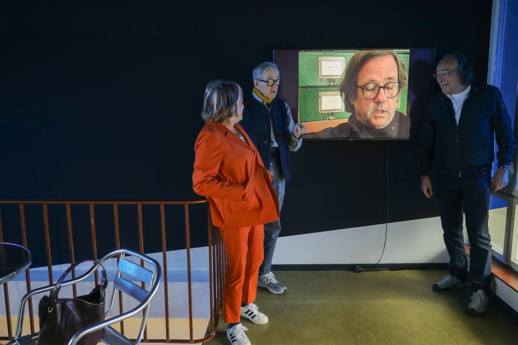 Fotos: 1. Jon Hendricks vor dem Großplakat des Guernica-Protests „And the babies?“ im Museum of Modern Art, New York 2. Anita Sieff, Jon Hendricks und Andreas Edelmann vor dem Filmporträt über Jon Hendricks von Anita Sieff (1999), © Matthias Reichelt, Berlin