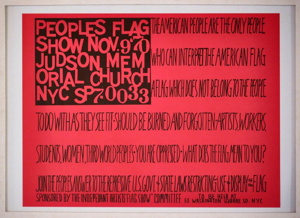 In the exhibition, political posters by artist and activist Faith Ringgold (*1930, Harlem, NY), the Attica Brothers Defense Fund, and the „Artists Poster Committee“ are shown for the first time, as well as exhibits from the „People’s Flag Show“, and the „Judson Three“.