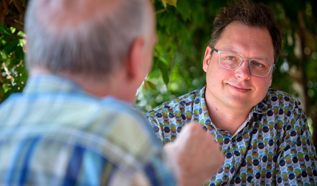 Timo Wans, r, von Wirtschaftsnetzwerk Myzelium, im Gespräch mit Dietrich Heissenbuettel