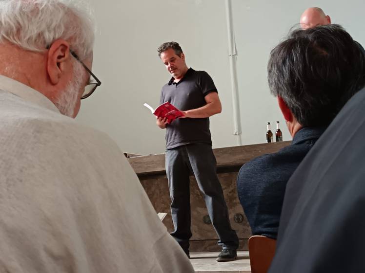 Staehle liest aus seinem gerade frisch erschienenen Gedichtband „Rote Sonnengänge – Walking Under a Red Sun“, für den Lo Castro das Titelbild und weitere Illustrationen geschaffen hat.