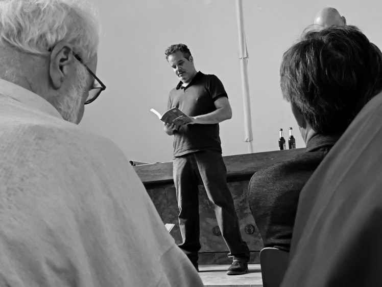Staehle liest aus seinem gerade frisch erschienenen Gedichtband „Rote Sonnengänge – Walking Under a Red Sun“, für den Lo Castro das Titelbild und weitere Illustrationen geschaffen hat.