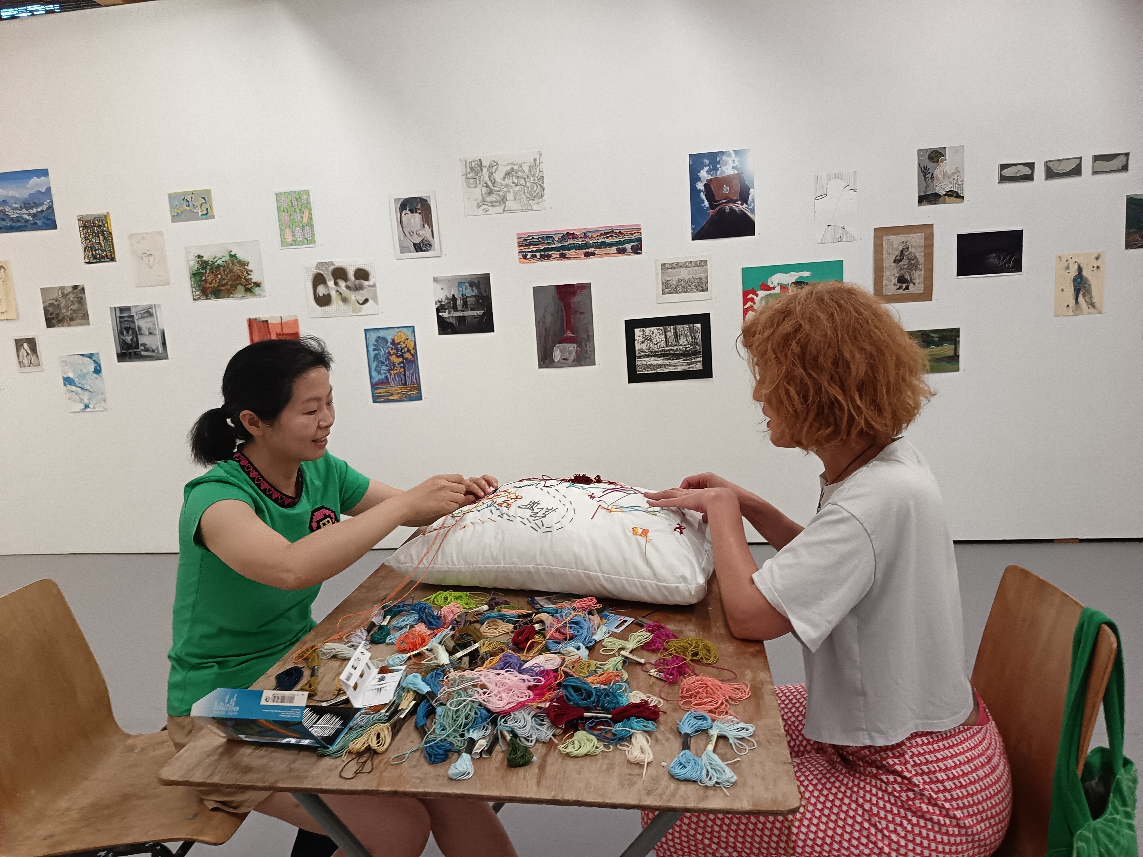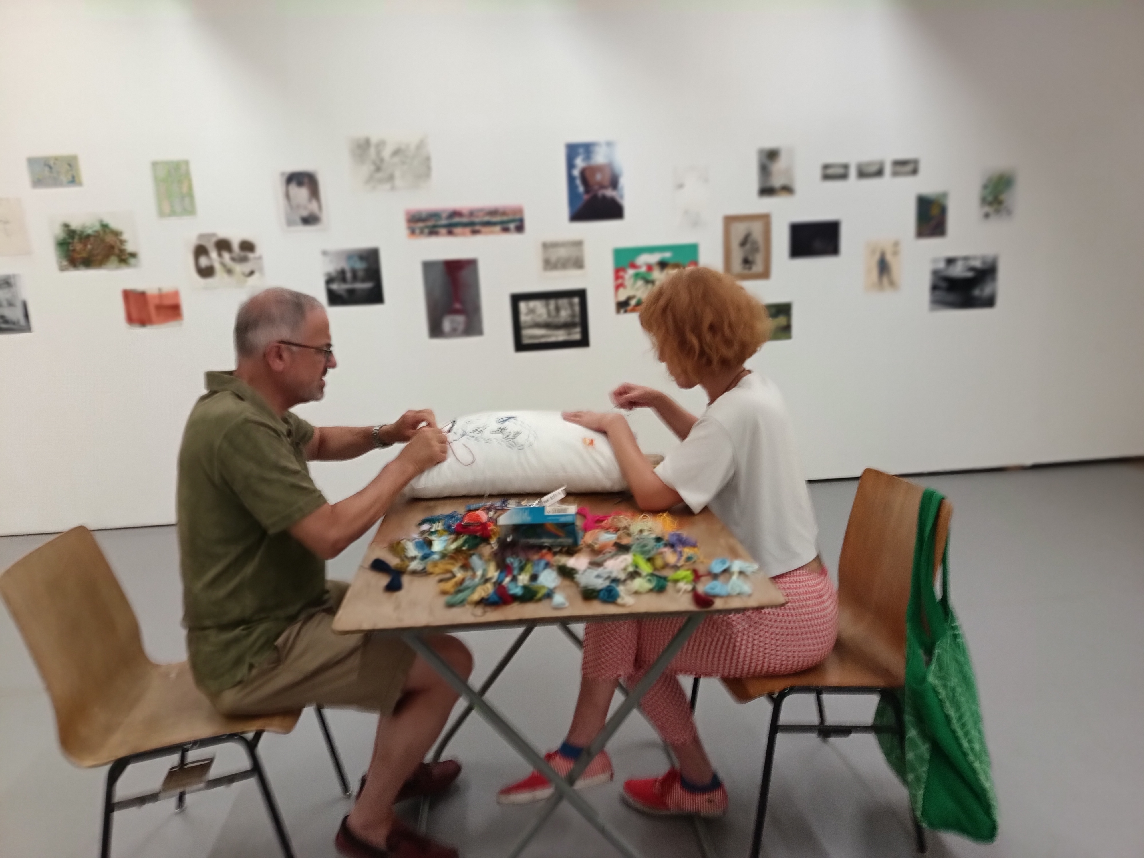 Dialog-Angebot: Künstlerin und Besucher:innen kommunizieren verbal und non-verbal über verschiedenfarbige Garne, die in ein Kissen gestickt werden. Die Stickereien überlappen und ergänzen sich zu einem polyphonen Chor.