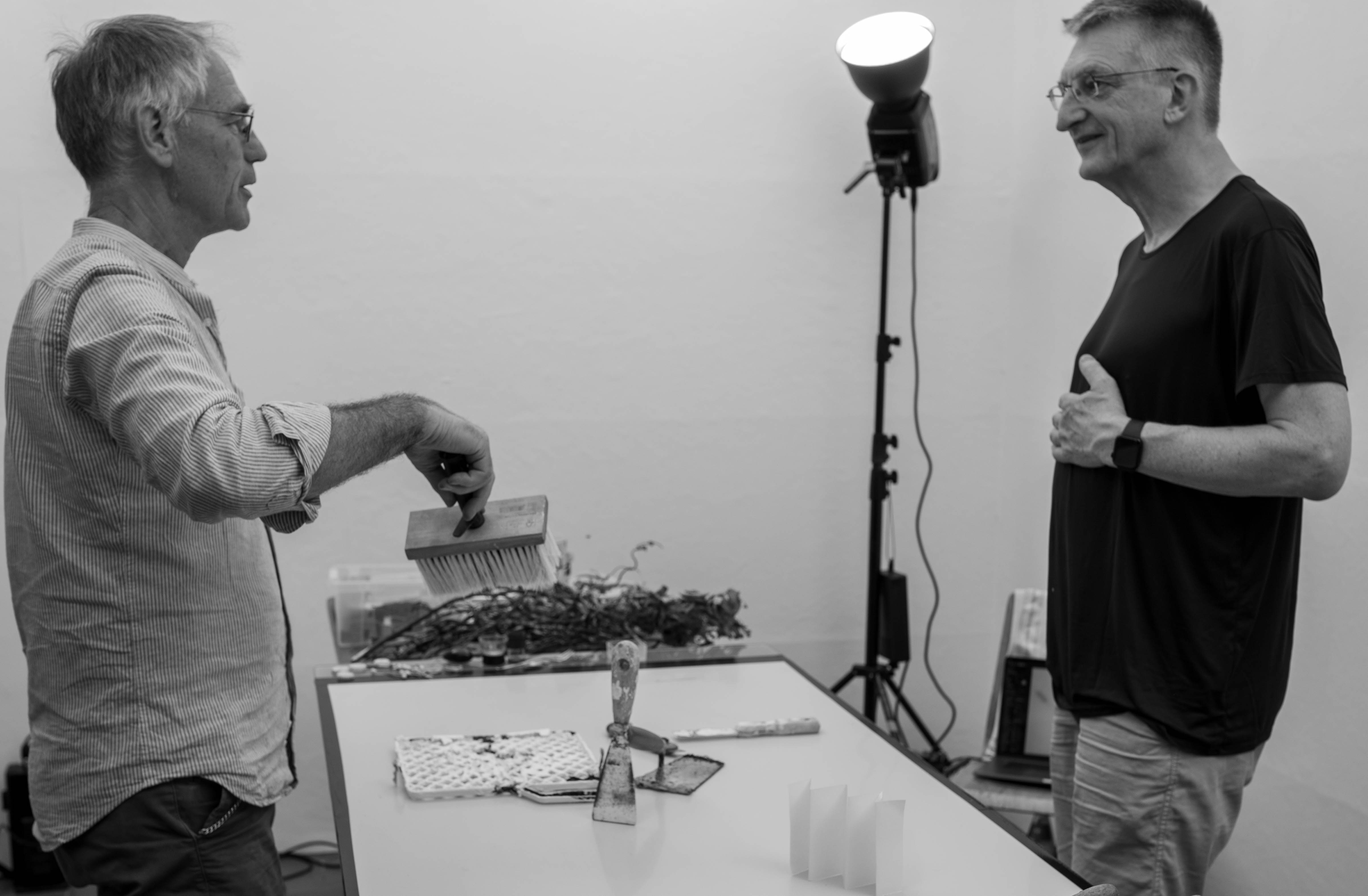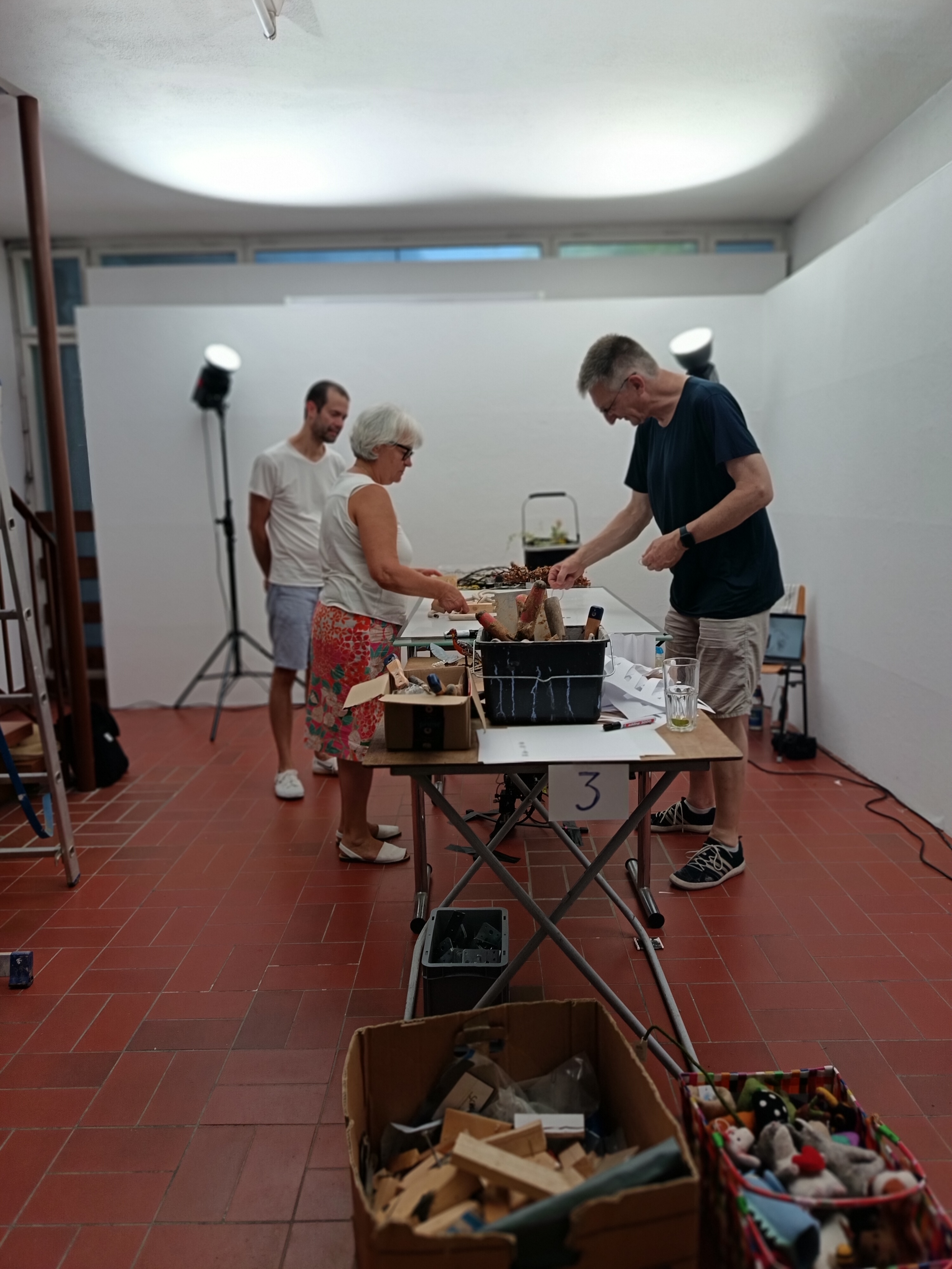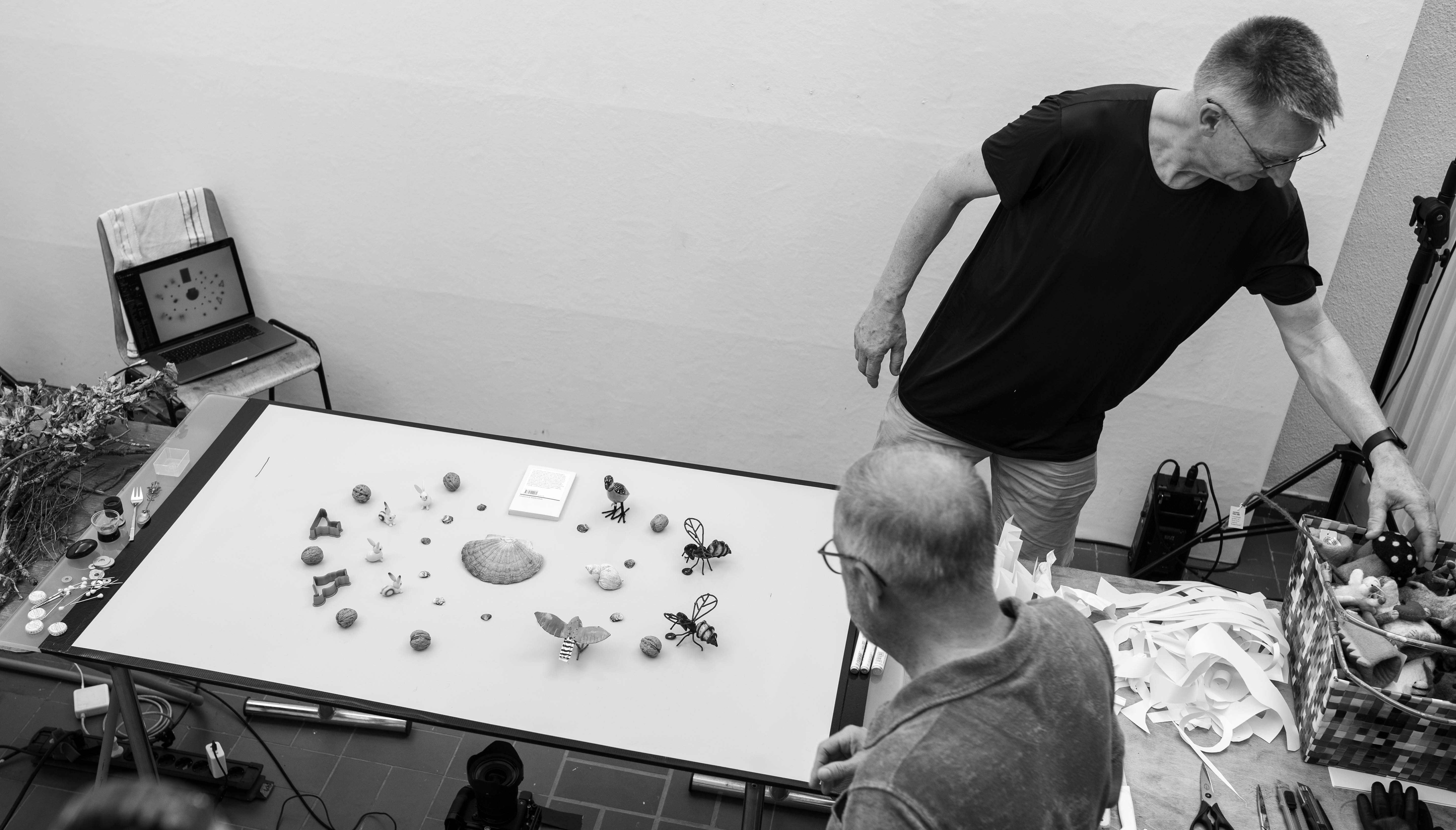 - Speed Dating mit Sinje Dillenkofer (28.6.) und Valentin Wormbs (29.6.) Dialog-Angebot: Inszenieren eines Fotoshootings mit Objekten Innerhalb von fünfzehn Minuten gestalten zehn Teilnehmer:innen jeweils ein Tableau auf einer großen Milchglasscheibe. Das finale Arrangement wird von oben und von unten fotografiert. Die beiden Aufnahmen werden später von den Künstler*innen zur Deckung gebracht und digital so bearbeitet, dass mit wechselnder Transparenz unterschiedliche Ansichten und Durchsichten auf die Objekte und deren Schatten möglich werden. Die zehn entstandenen Bilder können als manifestierte Gedächtnisspur zu den zehn Dialogen verstanden werden und lassen sich formal abstrakt, räumlich, gegenständlich oder mit metaphorischen Anspielungen lesen.