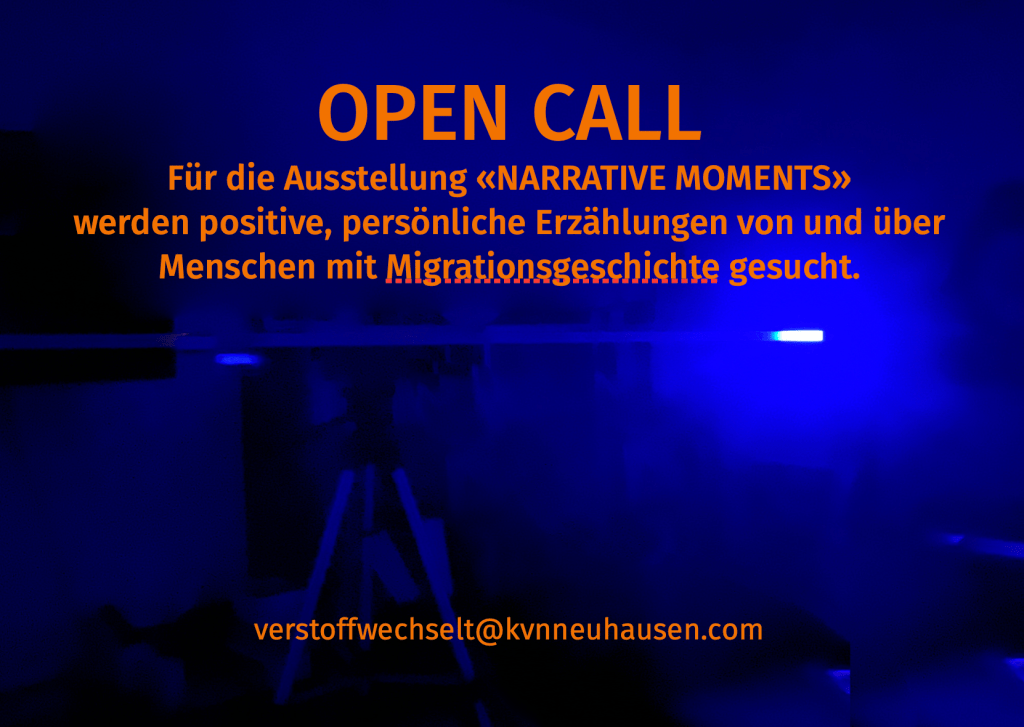 Für die Ausstellung „Narrative Moments“ im Kunstbezirk Stuttgart bittet das Künstlerteam «verstoffwechselt» um Tonaufnahmen sowie schriftliche Texte und Erzählungen, die von positiven Erlebnissen von und über Menschen mit Migrationsgeschichte berichten.