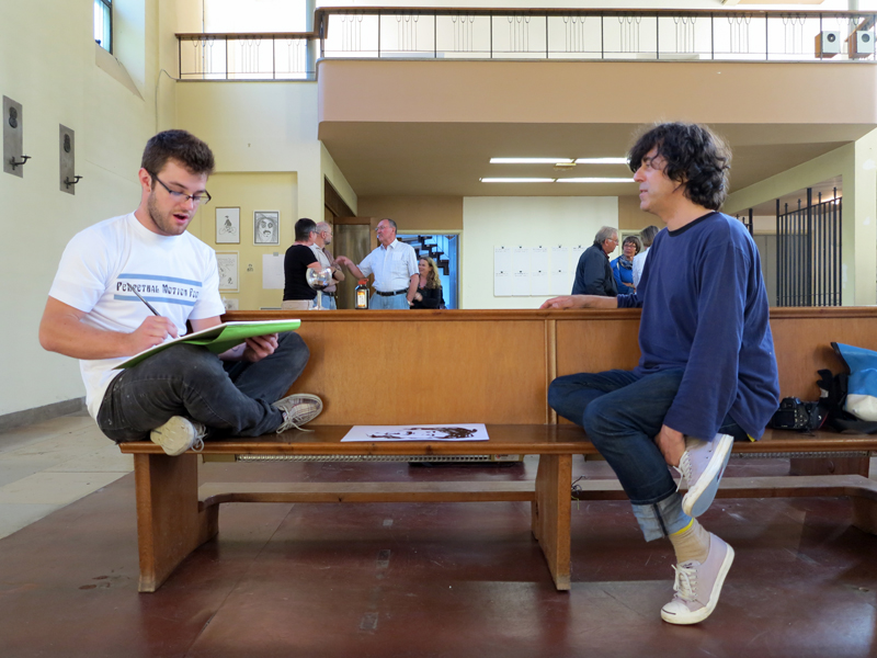 Abb.: Intern Joshua Meillier beim Porträtieren von Rainer Ganahl, Performance zur Preview am 15.6.2012