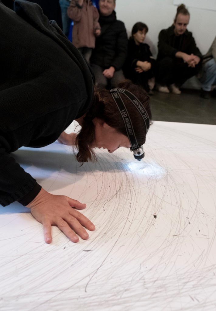 Dafür lud er vier Performer:innen ein, eine 10 Meter lange Papierbahn mit ungewöhnlichen Zeichengeräten zu bearbeiten. Aus Fundstücken hatte der Künstler neuartige Zeichenwerkzeuge gebaut, die an den Beinen, an den Armen oder am Kopf der Performer:innen befestigt wurden. Mit vollem Körpereinsatz wurden verschiedene Bewegungsabläufe und Interaktionen der Performer:innen auf das Zeichenpapier übertragen, die sich dort als Geste oder Spur manifestierten.